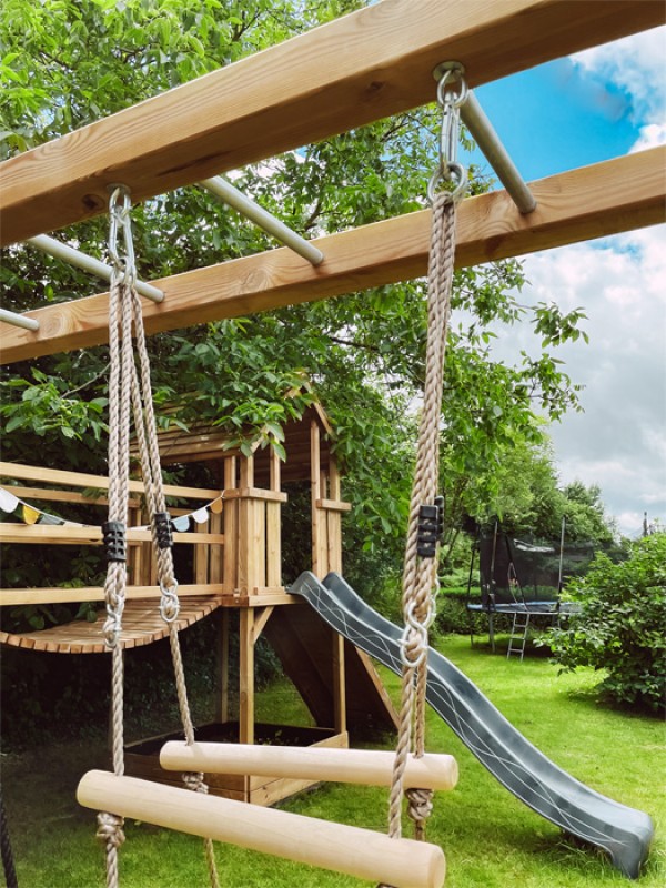 Die Seillänge ist verstellbar, sodass die Höhe der Schaukel leicht an Raum oder Alter des Kindes angepasst werden kann. Die Schaukel ist kompatibel mit allen Schaukelsystemen, die zwei Befestigungspunkte verwenden, und kann so an den meisten Gartengeräten, Konstruktionen oder Bäumen befestigt werden.