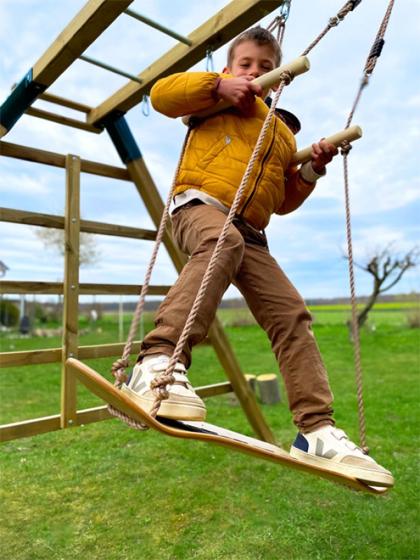 Die massive Holzplatte sorgt für Stabilität und lange Lebensdauer, während verstellbare Griffe und die rutschfeste Matte auch beim Stehen für Sicherheit sorgen. Ideal für aktives Spielen, das motorische Fähigkeiten, Gleichgewicht und Koordination fördert.