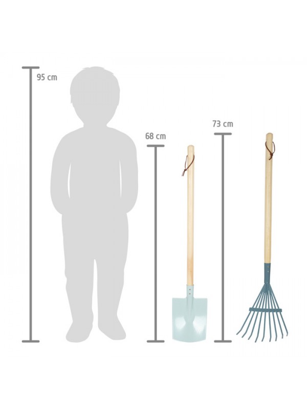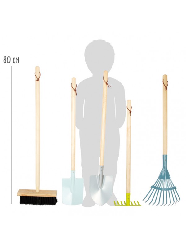 Gartengeräte-Set – zwei Schaufeln in verschiedenen Formen, eine Harke und eine Laubharke, ideal für erste Gartenarbeiten und Unterstützung bei der Gartenpflege. Dieses Kindergarten-Set ermöglicht Kindern, Verantwortung zu lernen und motorische Fähigkeiten beim Spielen im Freien zu entwickeln.