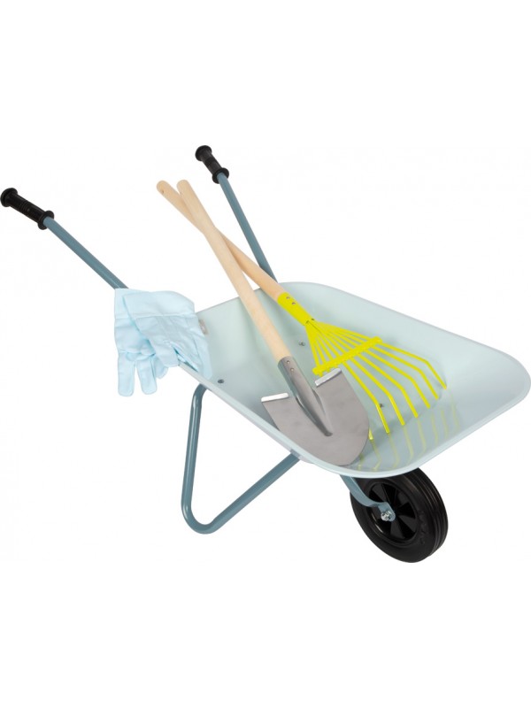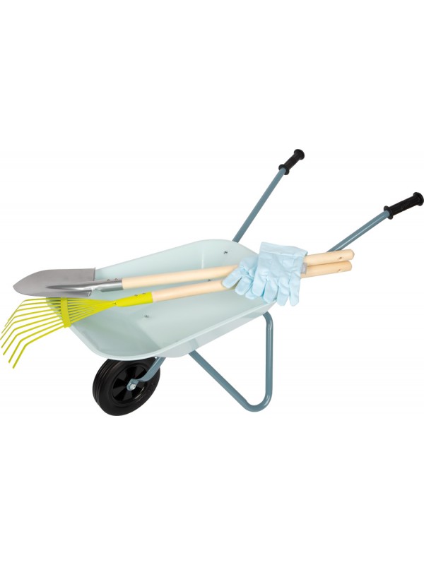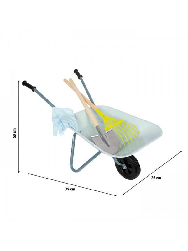 Set mit Schubkarre – robuste hellblaue Schubkarre mit einer Tragfähigkeit von bis zu 15 kg, zusammen mit Metall-Schaufeln und Harken mit Holzgriffen und Kinderhandschuhen. Die Schubkarre ermöglicht den einfachen Transport von Erde, Kompost oder anderen Gartengeräten und fördert gleichzeitig Spiel und praktische Aufgaben rund ums Haus.