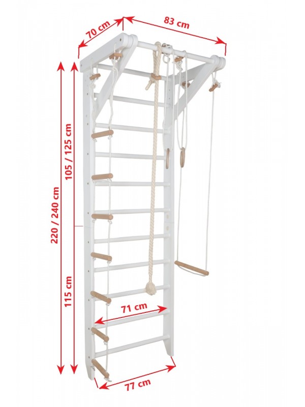 - Belastbarkeit: Leiter bis 150 kg | Obere Stange bis 100 kg | Hängende Elemente an Seilen bis 60 kg
