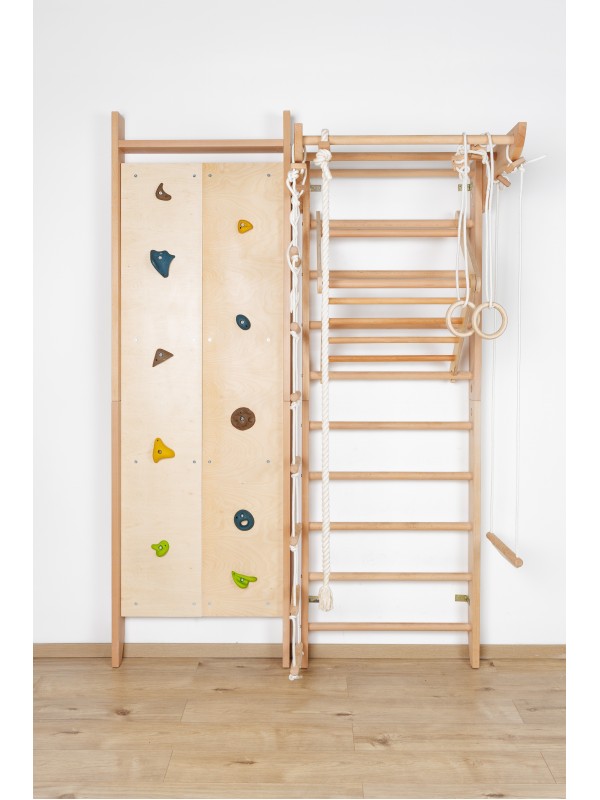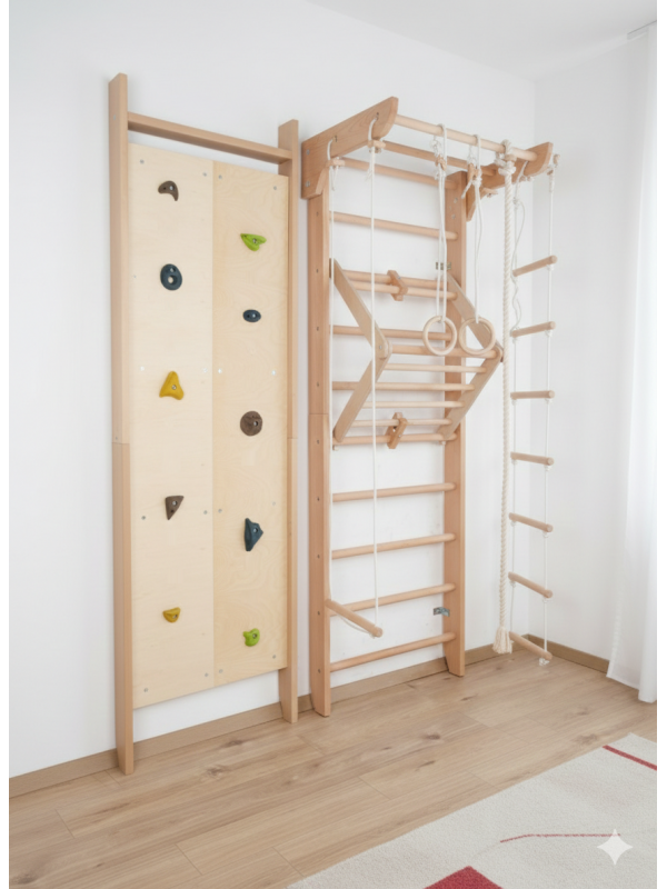 Climboo vereint die Funktionalität einer klassischen Sprossenwand mit einer spaßigen Kletterwand. Es fördert die Bewegungsentwicklung, Kraft, Gleichgewicht und Koordination und bietet gleichzeitig unendliche Möglichkeiten für Spiel und Bewegung im Innenbereich.
